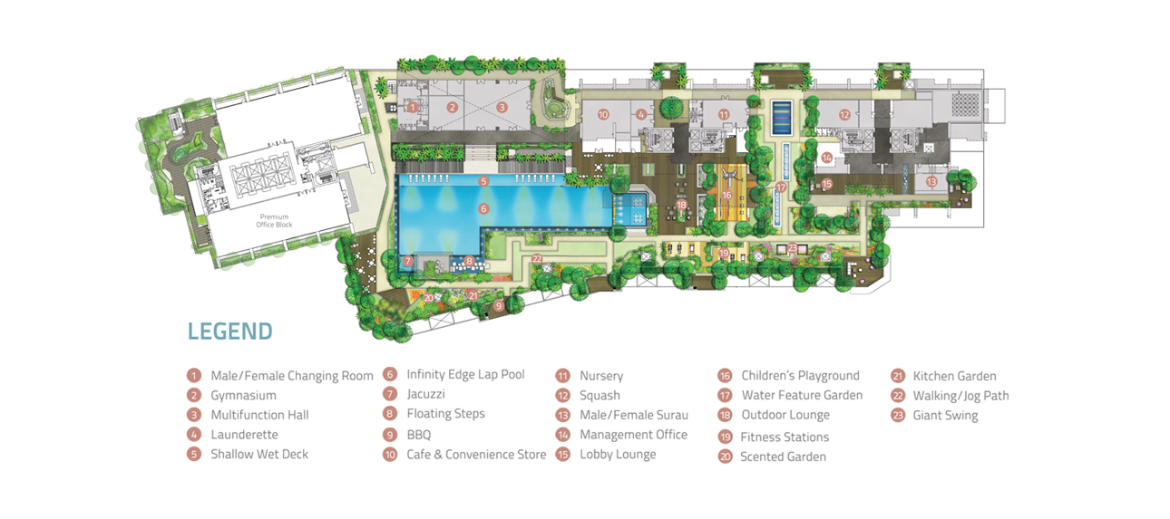 Built in compliance with the Green Building Index and recognised with Grade ‘A’ certification, the office tower presents 216 units of of workspaces, a podium comprising 40 Signature Office units.